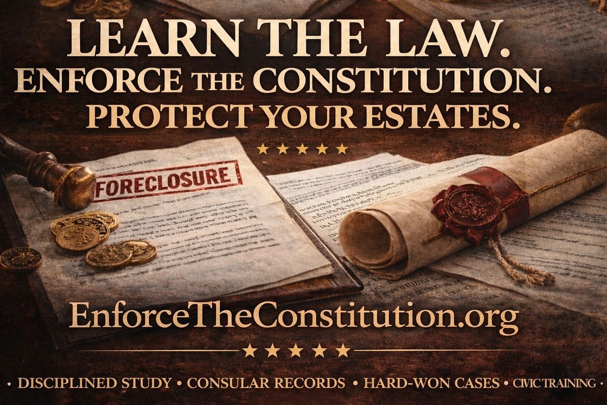 'Enforce the Constitution' civic organization is an active association or collective citizen body of conscious Moorish-American nationals, having in their possession, valid and confirmed Moorish nationality and identification cards; who act or convene as a political body, in accord with Moorish constitutional law and customs, to address local, national and international affairs and issues concerning the living Moorish nation.